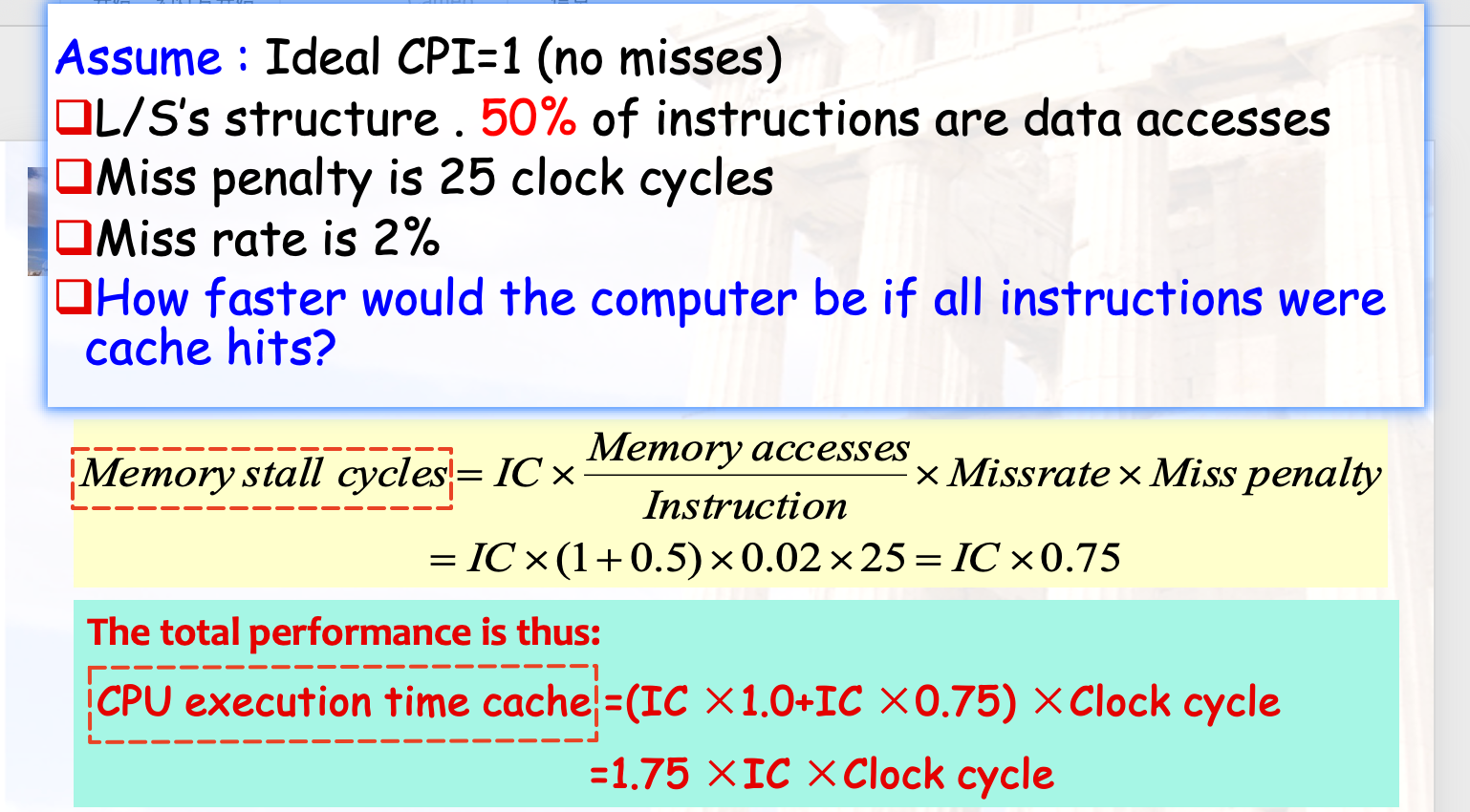 - MPI(memory reference per instruction)=1.5 , 也就是指令对mem的平均访问次数.